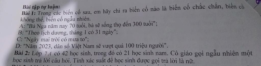 Gọi A là học sinh nữ trong lớp 7A, gọi x là xác suất: