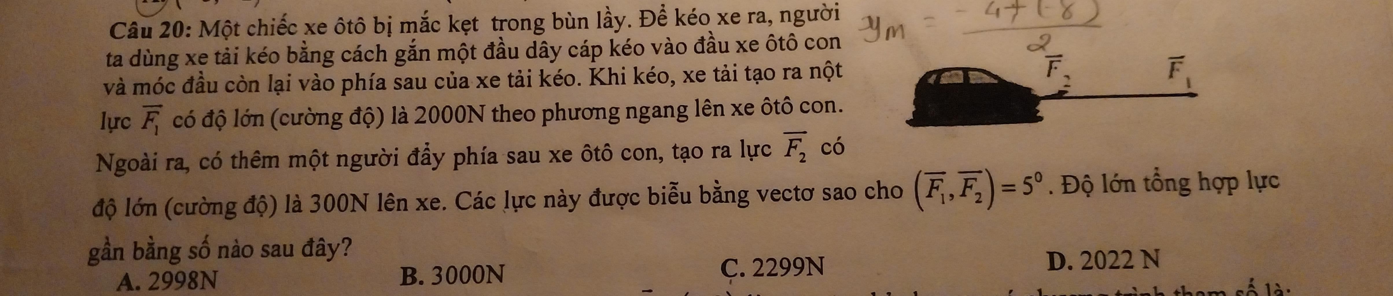 \Rightarrow F = \sqrt {{{2000}^2} + {{300}^2} + 2.2000.300.\cos 5} \\