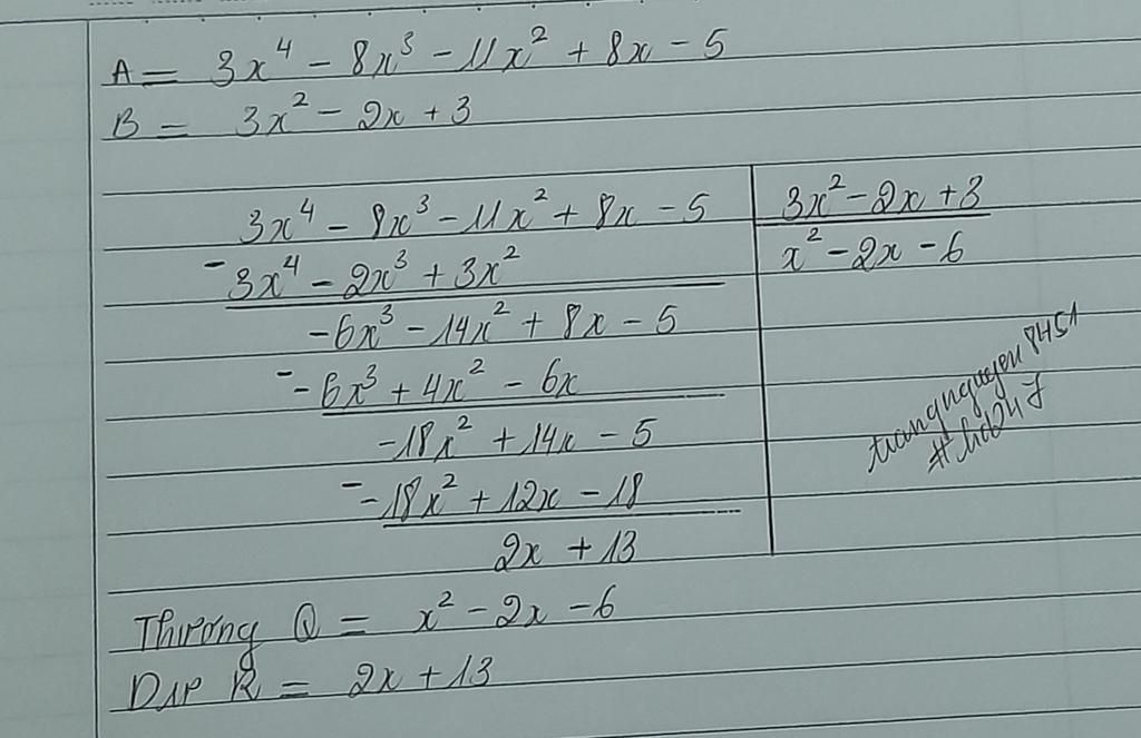 Vậy `(3x^4 - 8x^3 - 11x^2 + 8x - 5) : (x^2 - 2x - 6) =x^2 - 2x - 6 (` dư `2x+13)`.