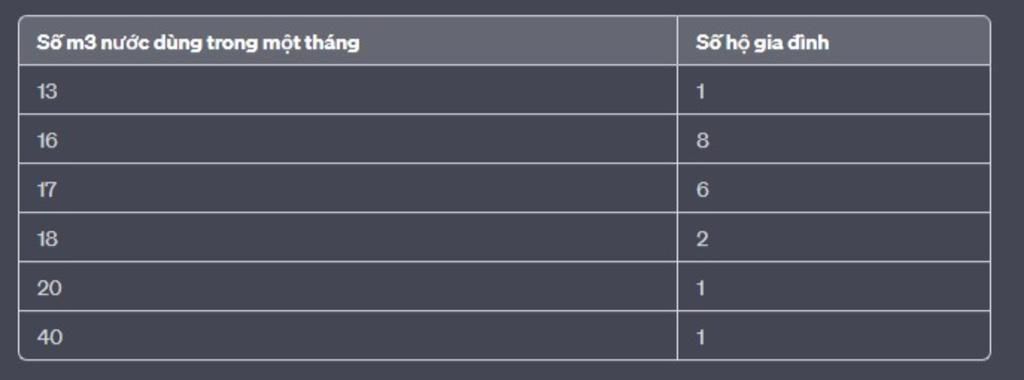 Tiêu chí thống kê là: số m3 nước dùng trong một tháng của mỗi hộ gia đình