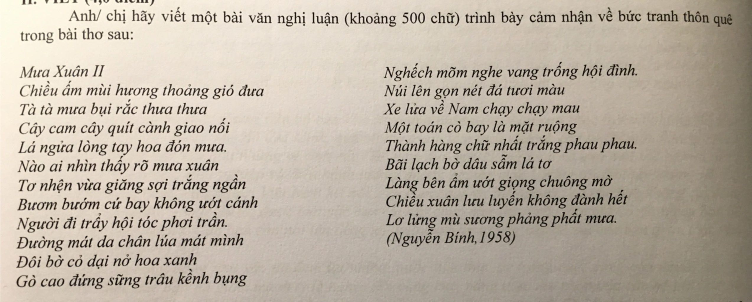 Thôn quê là một trong những chủ đề được nhiều tác giả sử dụng cả trong thơ lẫn văn học. Đây là chủ đề đã khá quen thuộc trong nền thơ ca, văn học Việt Nam. Và với tác giả Nguyễn Bính cũng vậy. Bài thơ "Mưa xuân $II$" của ông cũng miêu tả rõ cho người đọc thấy được bức tranh thôn quê thanh bình, đầy sức sống.