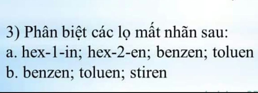 cho benzen, toluen vào td dd KMnO4 => mất màu thuốc tím chỉ có toluen