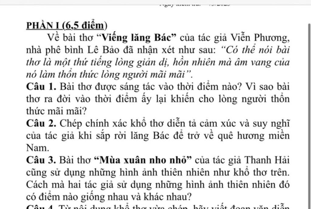 Câu 1: -Bài thơ được sáng tác vào năm 1976, sau khi cuộc kháng chiến chống Mỹ kết thúc, đất nước thống nhất, lăng chủ tịch HCM cx vừa khánh thành, tác giả ra thăm miền Bắc vào lăng viếng Bác