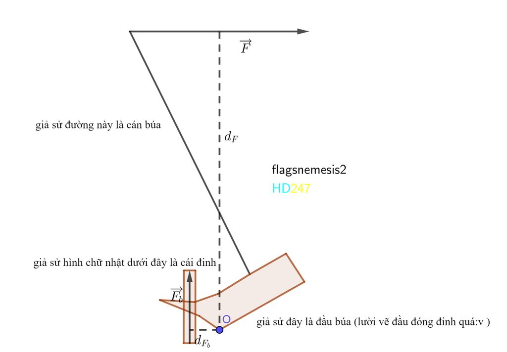 Gọi $d_F, d_{F_b}$ lần lượt là cánh tay đòn của lực tay $\overrightarrow{F}$ và lực tác dụng lên đinh $\overrightarrow{F_b}$
