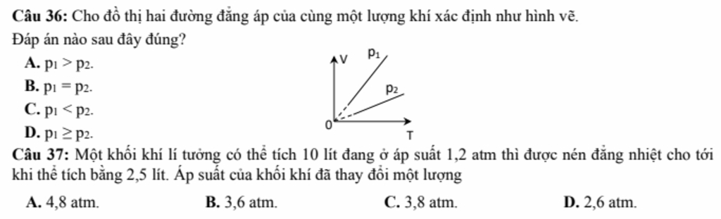 Trong các đường mô tả quá trình đẳng áp trong đồ thị V - T thì đồ thì càng cao thì áp suất p càng lớn