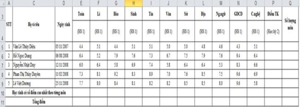 Câu 10:Trong bảng dữ liệu của Hình 1, hàm =COUNT(E5:O5) tại ô có địa chỉ Q5 sẽ cho kết quả bao nhiêu?