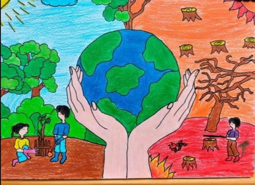 Đây là bức tranh vẽ Trái Đất mà em vô cùng ấn tượng. Hằng ngày khi đọc sách, báo, em biết Trái đất đang bị tàn phá nặng nề vì nạn chặt cây, phá rừng, ô nhiễm không khí,... ngày càng nghiêm trọng. Nên khi nhìn bức tranh em lập tức nghĩ ngày đến những điều đấy. Bức tranh vẽ Trái Đất được đưa đi cấp cứu, nhưng vì đường quá nhiều bụi bặm nên Trái Đất phải đeo khẩu trang. Bức tranh như muốn cảnh báo chúng ta hãy nhanh chóng hành động, hãy bảo vệ Trái Đất. Em mong mình cùng các bạn sẽ làm được nhiều việc góp phần bảo vệ Tráu Đất, để Trái Đất luôn khỏe mạnh.