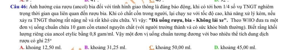 Câu 46: Ảnh hưởng của rượu (ancol) bia đối với tình hình giao thông là đáng báo động, khi có tới hơn 1/4 số vụ TNGT nghiêm