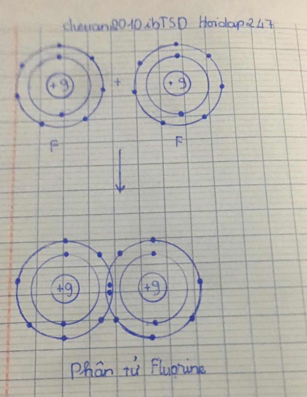 Hai nguyên tử của nguyên tố Fluorine có 7 electron lớp ngoài cùng nên liên kết với nhau để có được lớp electron bền vững giống như khí hiếm