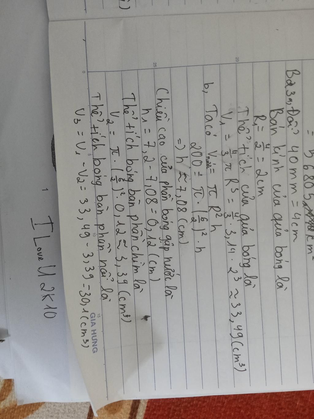 ủa nếu diện tích đấy nhân với chiều cao mực nước dâng lên = thể tích lượng nước đó, chứ đâu phải thế tích phần chìm của quả bóng hình cầu đâu nhỉ?