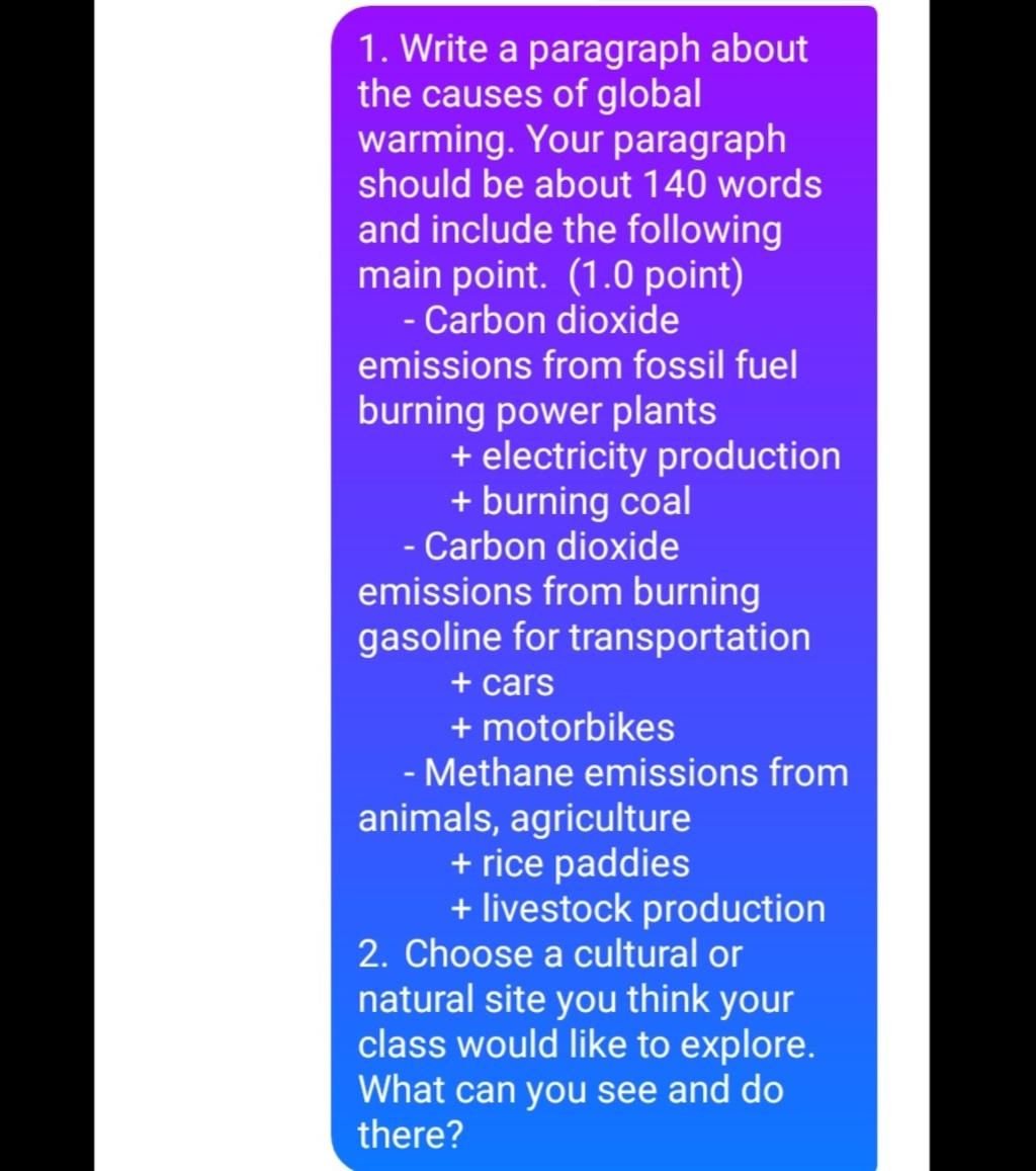 Global warming is a critical challenge facing our planet, and multiple factors contribute to this climate change phenomenon. One of the primary causes of global warming is carbon dioxide emissions. This pollution originates from the burning of fossil fuels in power plants, electricity production, and burning coal. The emissions from transportation, such as burning gasoline in cars and motorbikes, also release high levels of carbon dioxide. Methane emissions also play an important role in global warming and stem from agriculture and animal waste. Rice paddies and livestock production are examples of agricultural practices that emit a significant amount of methane. The buildup of these greenhouse gases traps heat in the atmosphere, which leads to an increase in global temperatures and a range of negative effects on our planet. It is essential to limit and control these emissions to mitigate the impact of global warming on our.