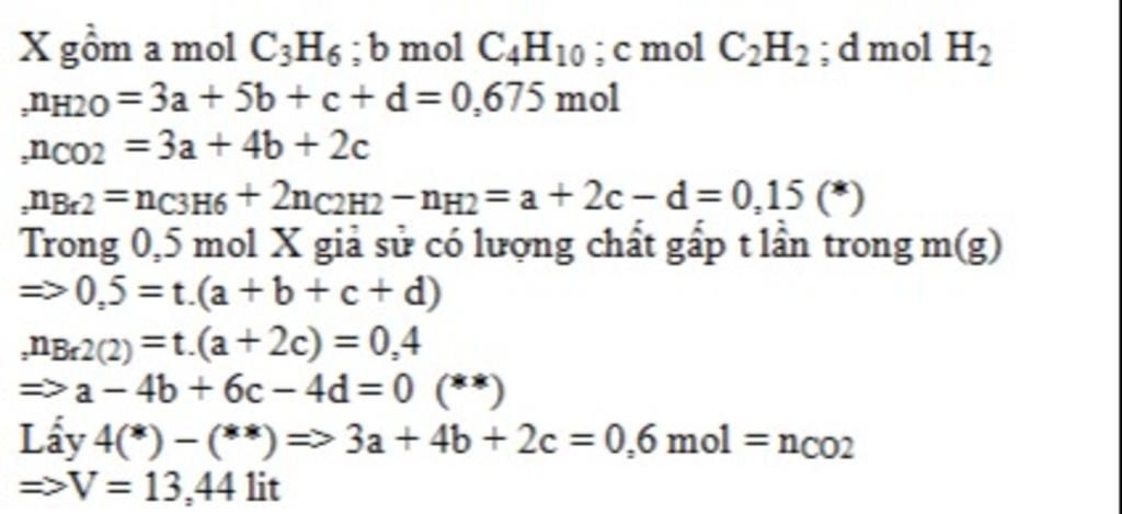 Hỗn hợp X gồm C3H6 , C4H10 , C2H2 và H2 ( các Hidrocacbon đều mạch hở).Nung m gam X trong bình kín với một ít bột Ni đến khi các pứ xảy ra hoàn toàn thu được hỗn hợp Y.Đốt cháy hoàn toàn Y , thu được V lít CO2 ở đktc.Biết hỗn hợp Y làm mất màu tối đa 150ml dd Br2.Cho 11,2l đktc hh X đi qua bình đựng dd Br2 dư thì có 64g Br2 phản ứng.Tính V