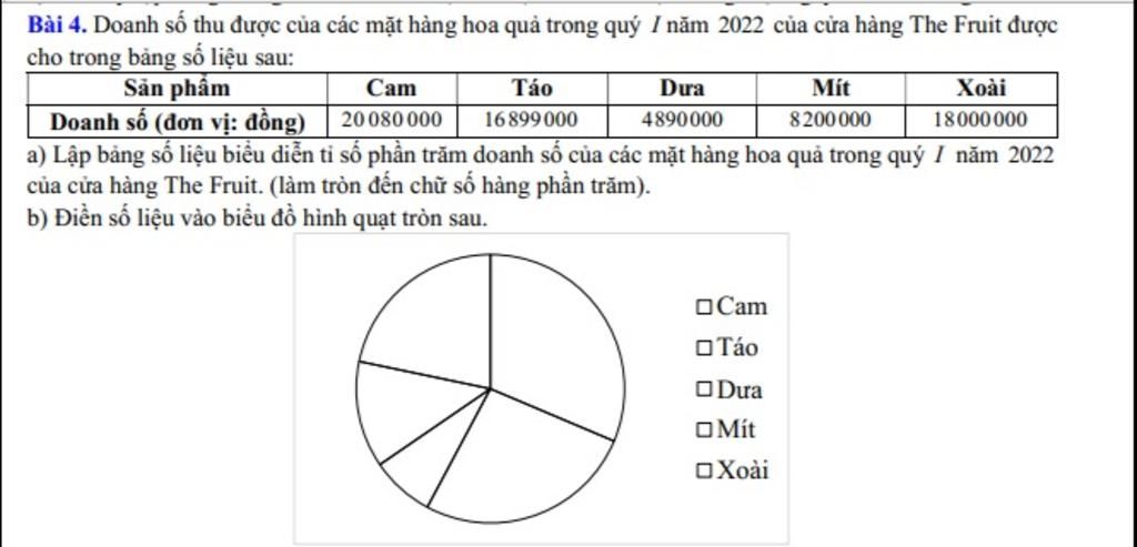 Bài 4. Doanh số thu được của các mặt hàng hoa quả trong quý I năm 2022 của cửa hàng The Fruit được