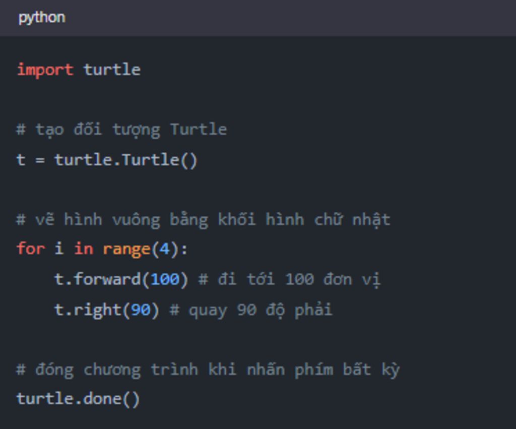 sử dụng các thư viện đồ họa như có sẵn trong nhiều ngôn ngữ lập trình. Ví dụ về cách vẽ các hình cơ bản bằng ngôn ngữ lập trình Python và thư viện đồ họa Turtle: