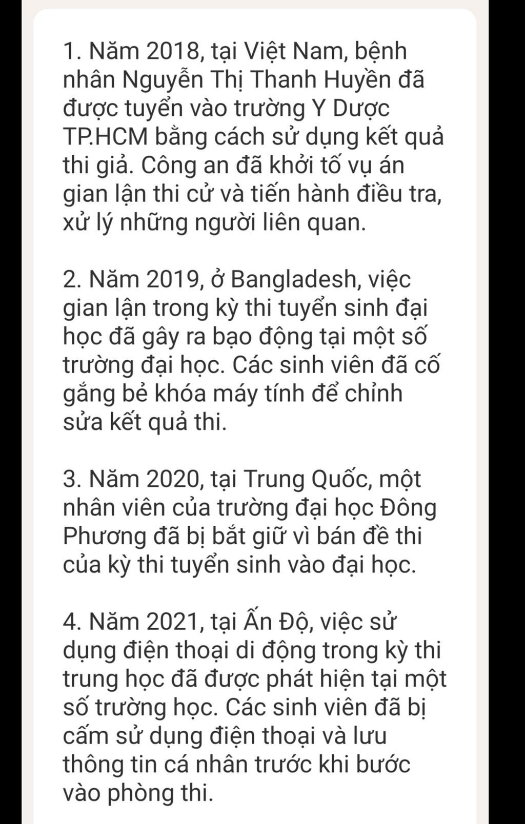 `-` Ngày $14/7/2022$, đại diện Sở GD&ĐT Quảng Ninh xác nhận thông tin tại buổi thi môn tiếng Anh trong kỳ thi tốt nghiệp THPT vừa qua, một thí sinh ở điểm thi trường THPT Đầm Hà, Quảng Ninh sử dụng điện thoại iPhone XS Max, thiết bị phát Wi-Fi di động nhằm truyền đề thi ra ngoài để nhờ trợ giúp.