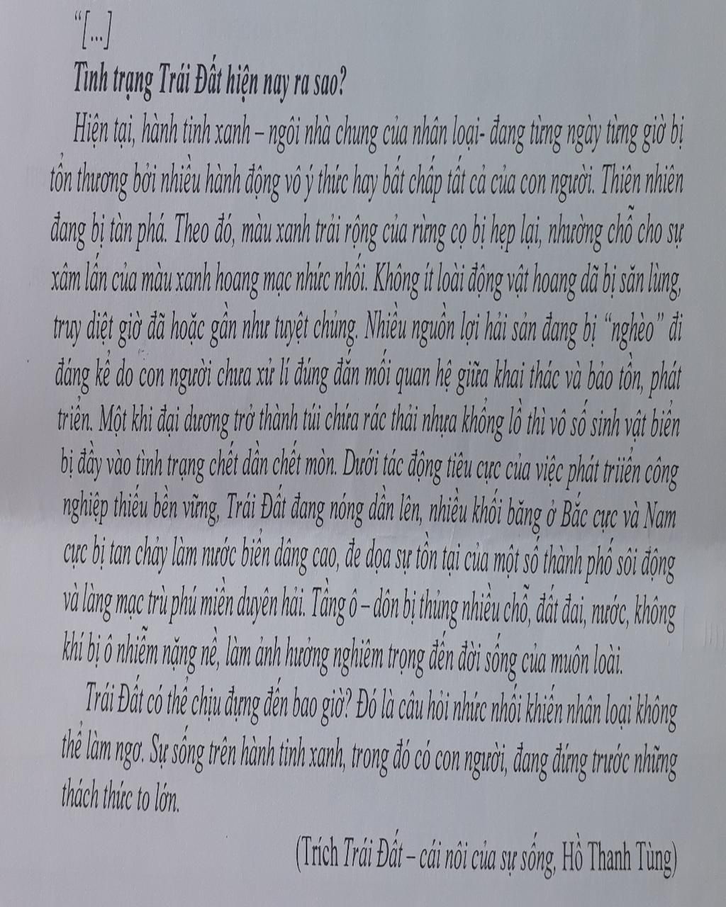 C`7`: Câu hỏi ở cuối đoạn văn "Trái Đất có thể chịu đựng đến bao giờ?" gợi cho em suy nghĩ: