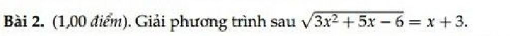Cho phương trình $\sqrt{3x^2+5x-6}=x+3$