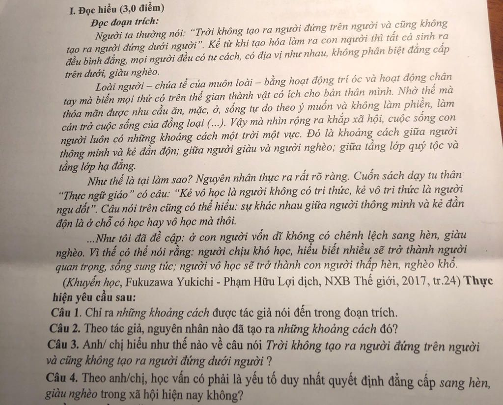 Câu 1: Khoảng cách giữa người thông minh và kẻ đần độn, giữa người giàu và người nghèo, giữa tầng lớp quý tộc và tầng lớp hạ đẳng.