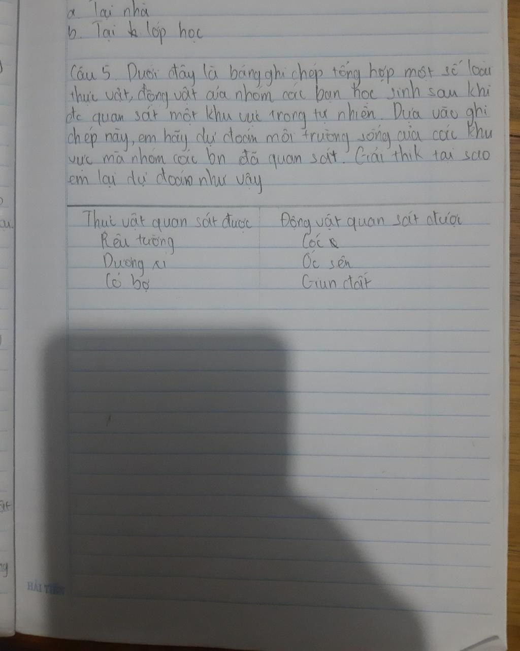 Trong bảng là những loài thực vật và động vật ưa ẩm, chỉ sống ở nững nơi có độ ẩm cao và ít ánh sáng, do đó, khu vực quan sát là nơi ẩm ướt, có thể là chân tường, bờ ao, hồ,