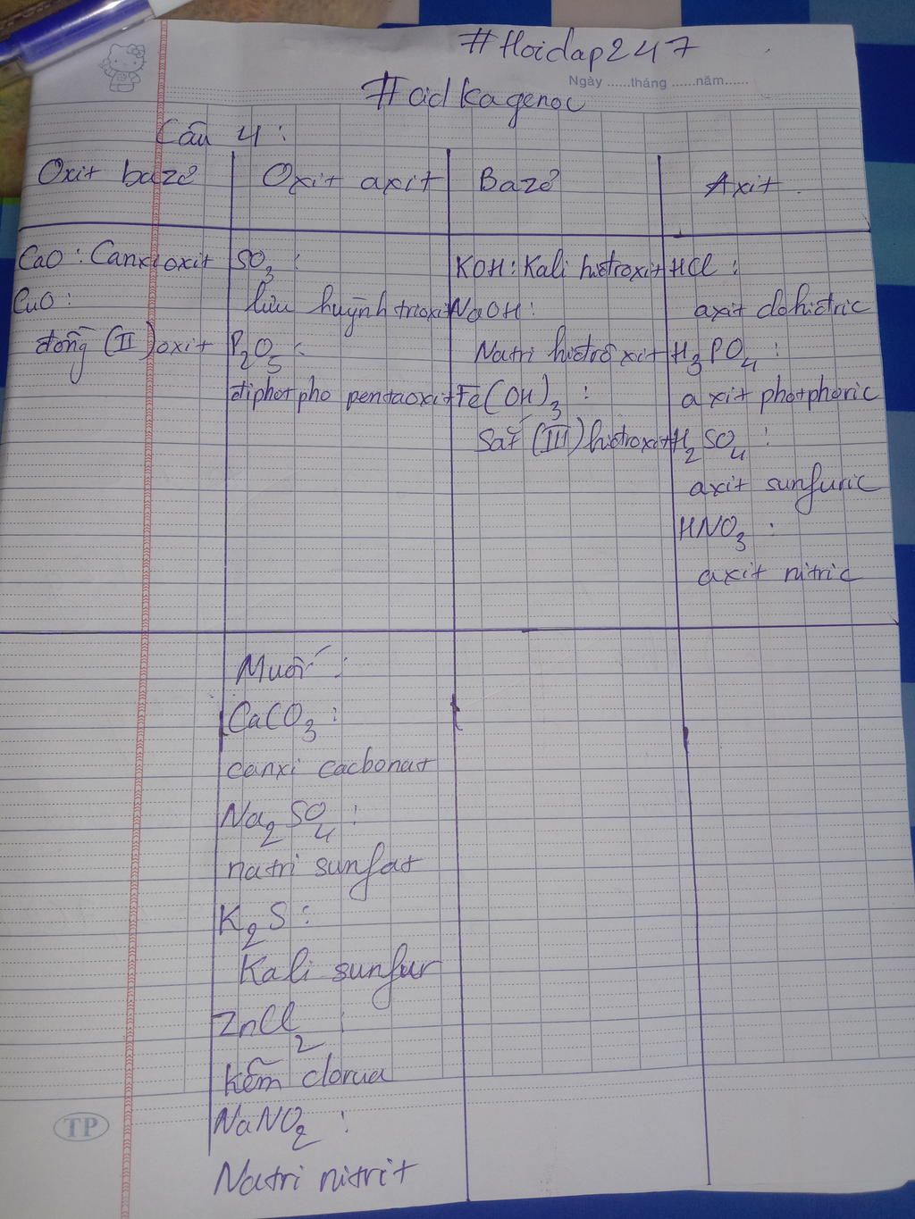 Câu 4. Phân loại và gọi tên các hợp chất bao sau: NaHSO4; KOH; HCl; H3PO4, CaO; H2SO4; HNO3; NaOH; Fe(OH)3; CuO; SO3; P2O5; CaCO3; Na2SO4; K2S; ZnCl2; NaNO2.