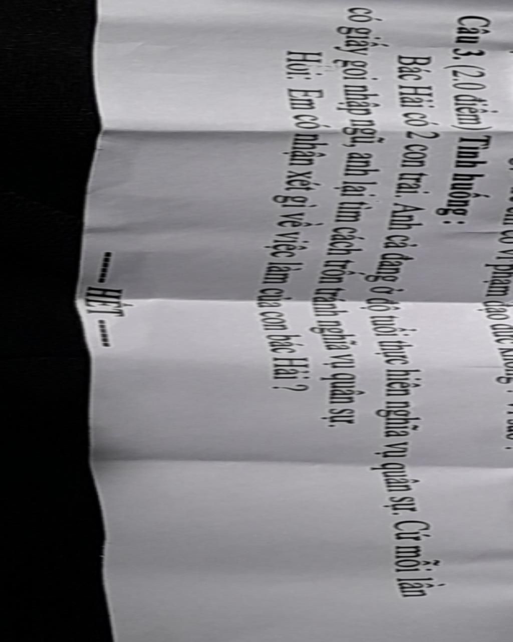 `->` Hành vi của anh ( con đầu bác hải ) là sai và vi phạm luật quân sự vì lời kêu gọi đi quân sự của nhà nước thì bắt buộc phải đi . Còn nếu không đi thì sẽ bị phạt theo quy định của pháp luật