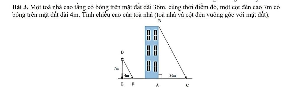 Do góc tạo bởi tia nắng mặt trời và mặt đất bằng nhau nên `∠C =∠F`