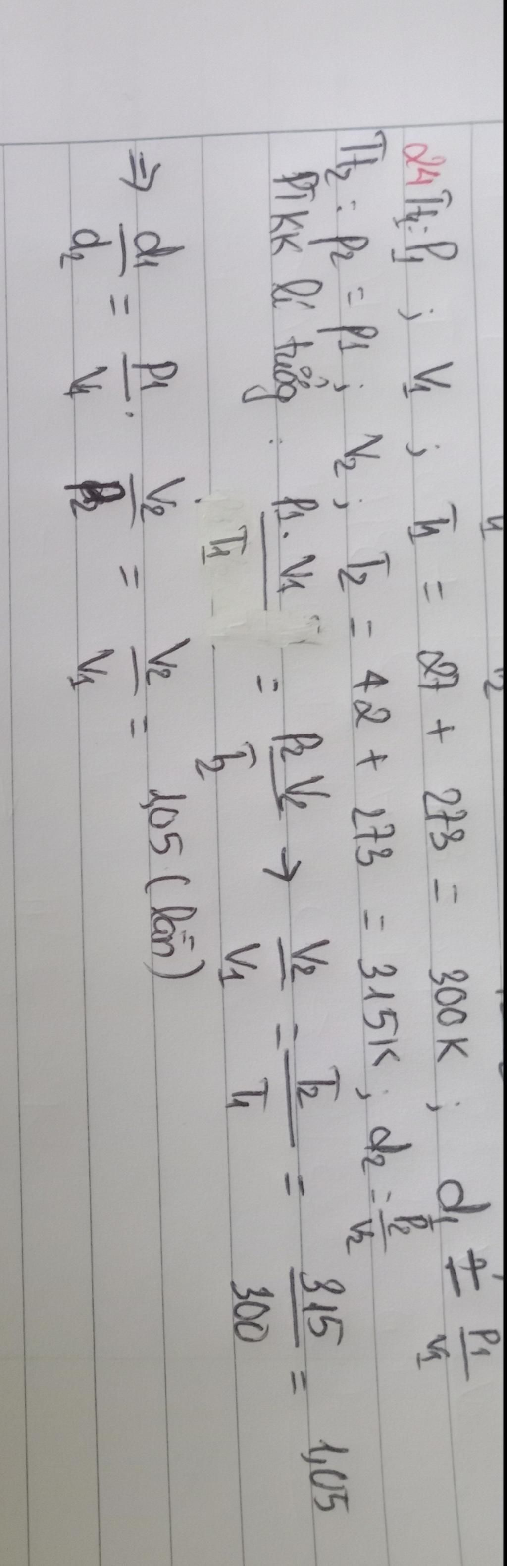 \[pV = nRT \Leftrightarrow pV = D.V.R.T \Rightarrow DT = \frac{p}{R} = const \Rightarrow D'T' = D.T \Leftrightarrow \frac{{D'}}{D} = \frac{T}{{T'}} = \frac{{27 + 273}}{{42 + 273}} = 0,95\]