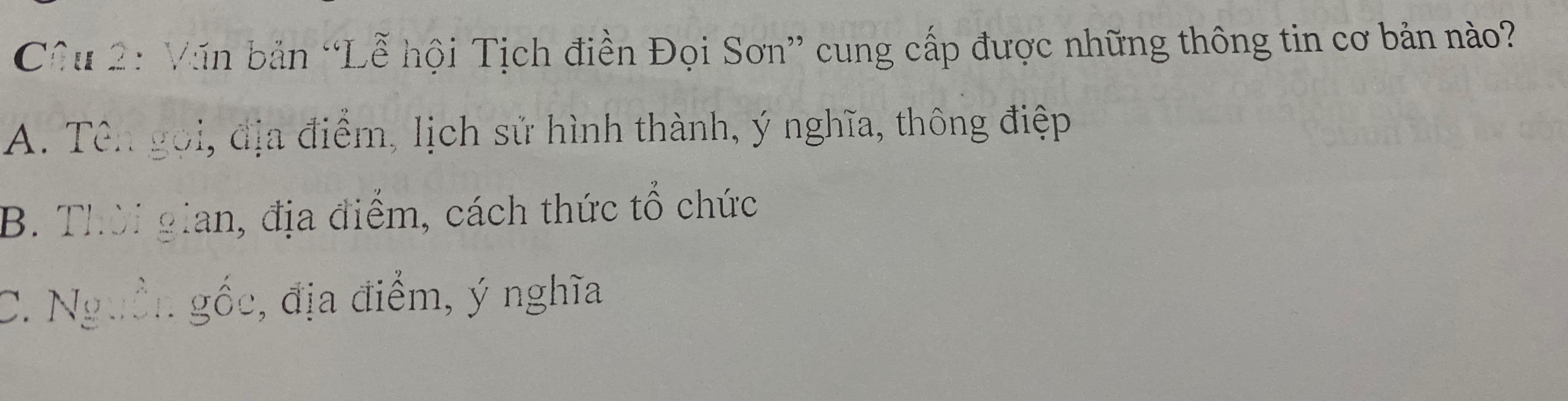 `-` Đáp án `A.` Tên gọi, địa điểm, lịch sử hình thành, ý nghĩa, thông điệp.