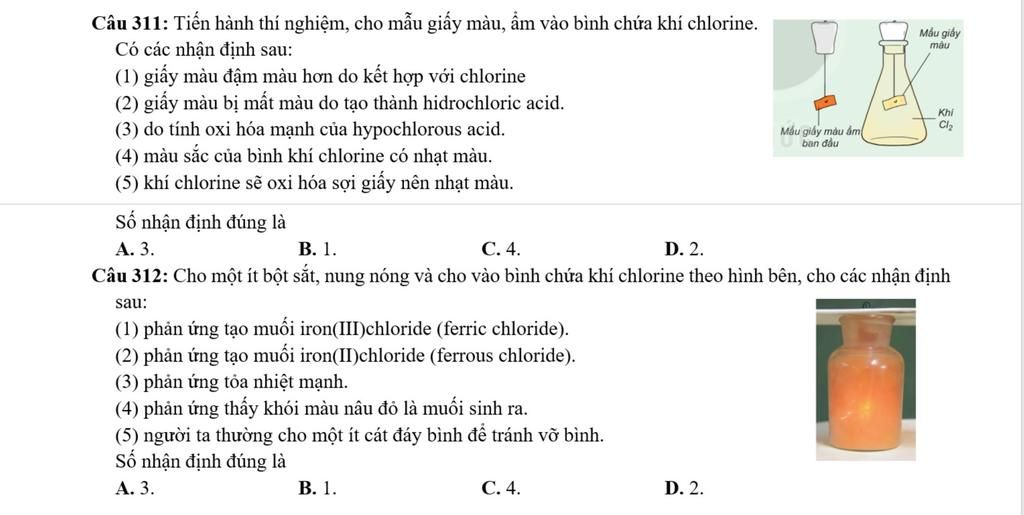 (2) Sai. Giấy màu bị mất màu do tạo thành hypochlorus acid ($HClO$) có tính oxy hoá mạnh.