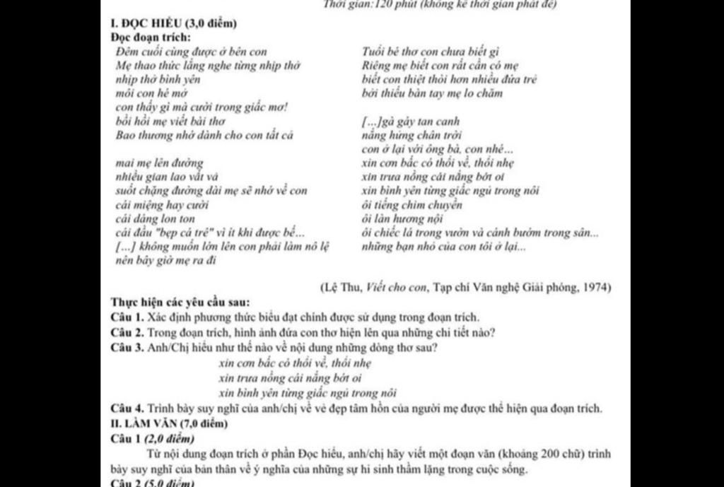 Câu 4: Người mẹ hiện lên với lòng yêu thương con da diết, sự hy sinh, lo lắng, quan tâm đến con vô bờ.