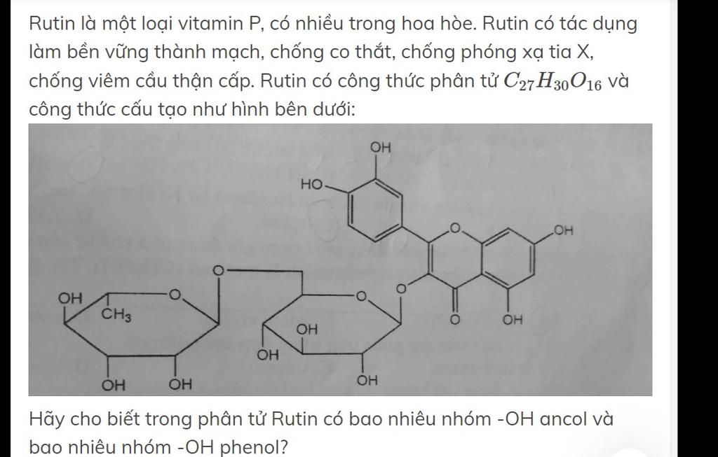 `-` Nhìn vào ảnh có công thức được người ra đề cho trên đề ta thấy $Rutin$ có $4 \,\, -OH \,\, phenol$(được khoanh đỏ trong ảnh) và $6 \,\, -OH \,\, ancol$(được khoanh màu đen)