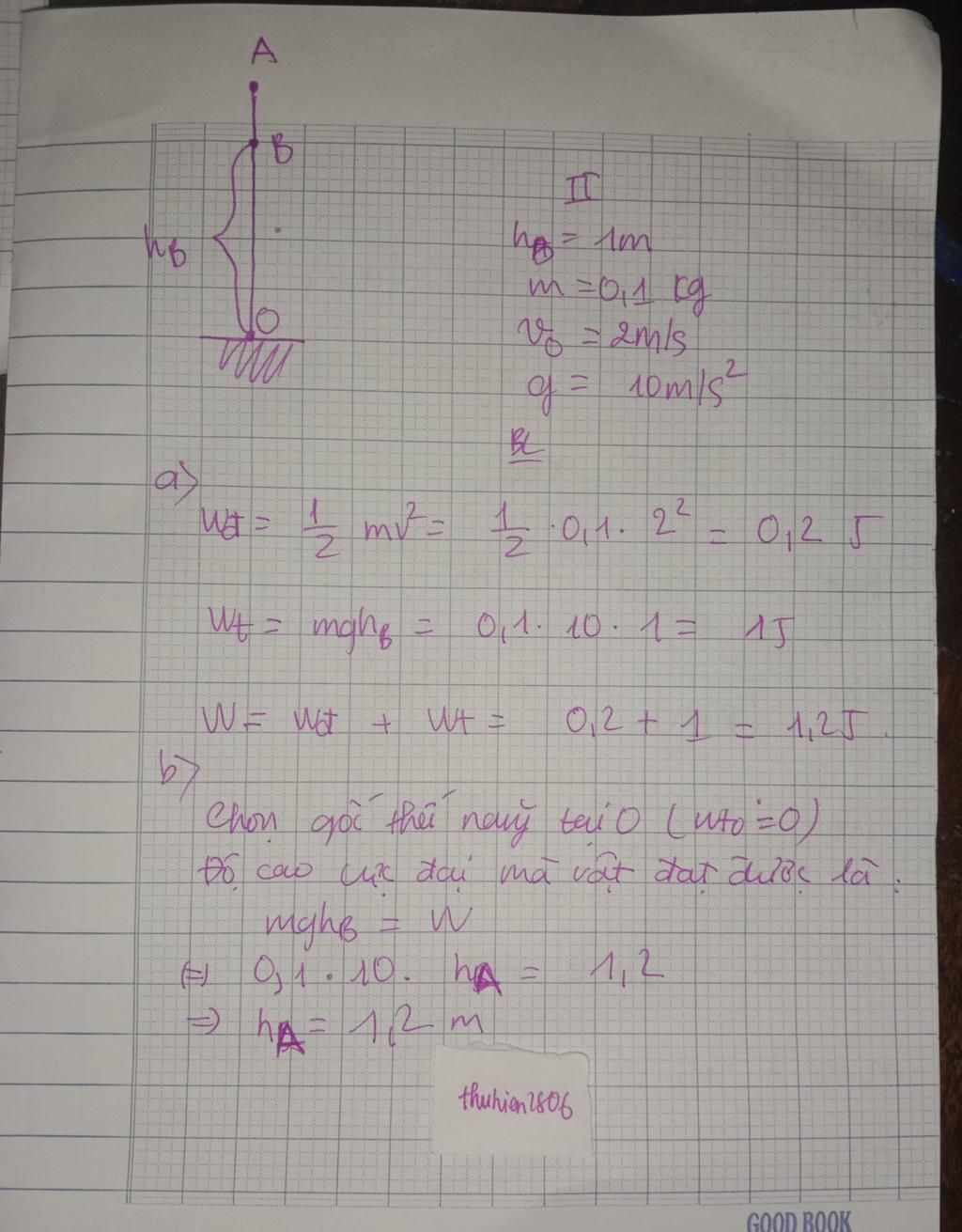Câu a thế năng =0 nh bạn. Độ gốc thế năng tại vị trí ném là ở trên độ cao 1m