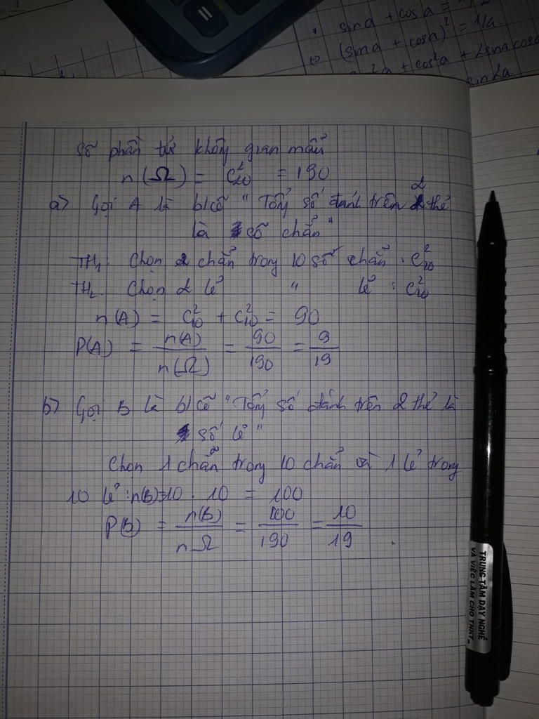 Có 20 tấm thẻ được đánh số từ 1 đến 20, chọn ngẫu nhiên hai tấm thẻ. Tính xác suất các biến cố: a)"Tổng số đánh trên hai thẻ là số chẵn" b)"Tổng số đánh trên hai thẻ là số lẻ"