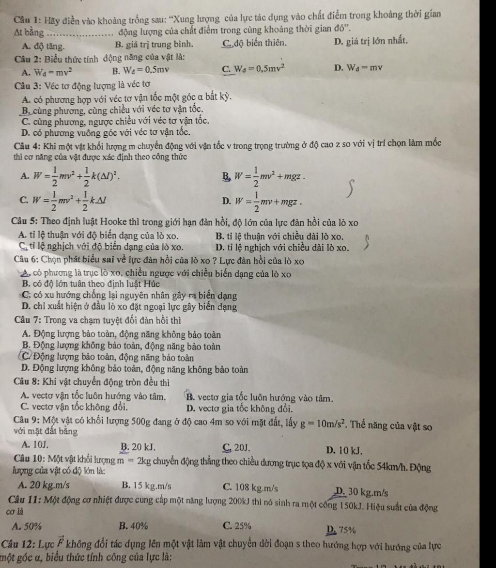 Câu 1: Hãy điền vào khoảng trống sau: “Xung lượng của lực tác dụng vào chất điểm trong khoảng thời gian