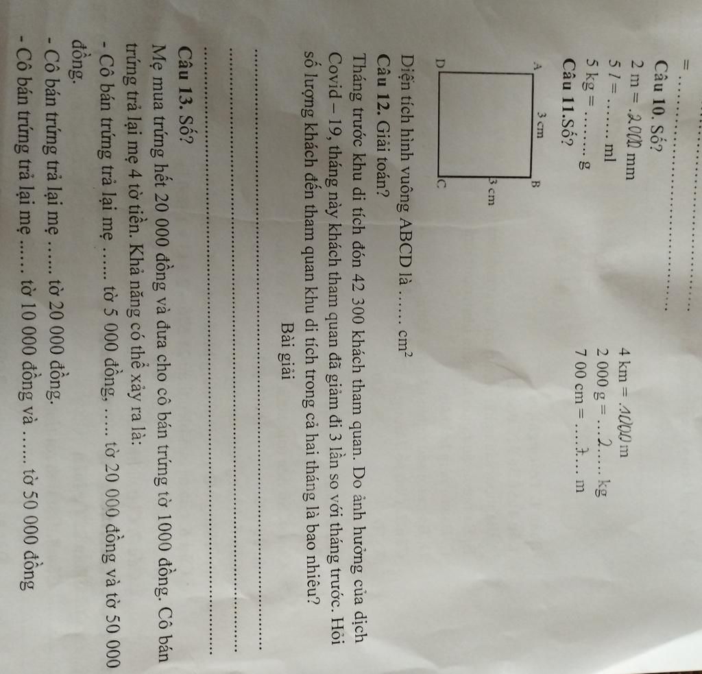 câu 13: 2 tờ 5 nghìn đồng, 1 tờ 20 nghìn đồng,1 tờ 50 nghìn đồng