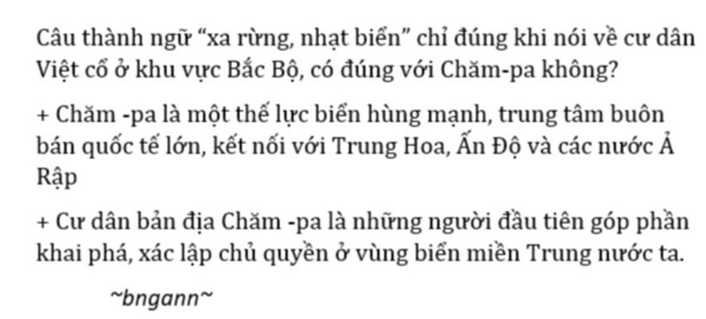 đáp án : ⇒ Câu thành ngữ "xa rừng, nhạt biển" không có liên quan trực tiếp đến hoạt động kinh tế ở Champa vì nó chỉ là một câu thành ngữ phổ biến trong ngôn ngữ Việt Nam, được sử dụng để miêu tả một người hay một vật phẩm không có tính chất đặc trưng riêng, không nổi bật, không đặc sắc.
