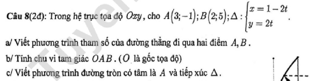 Ta có: `R=d(A,\Delta)=abs(3-1-1)/sqrt(1^2+1^2)=sqrt2/2`