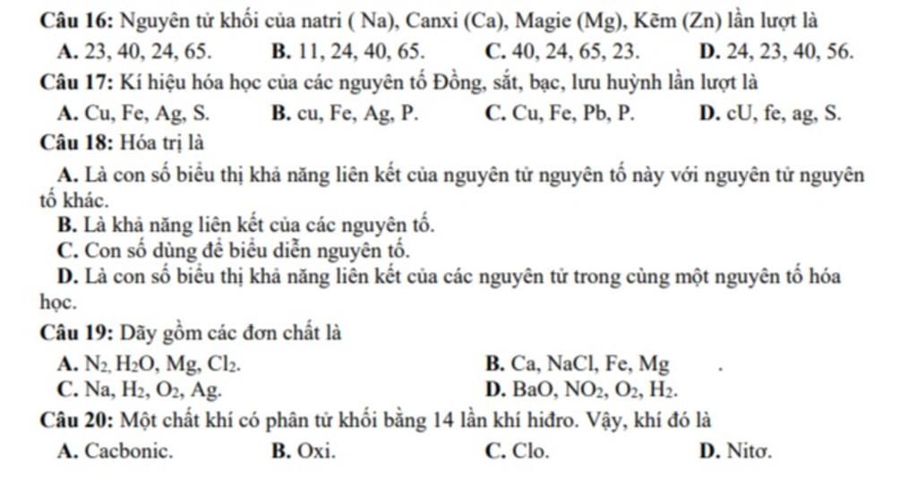 acsquys8Thông thái22:13 câu 16: A câu 17: A câu 18: Hóa trị cho ta biết khả năng liên kết với nhau của các nguyên tử chọn B câu 19: chọn C câu 20: gọi chất đó là X M X = 1.14 = 14 đ v c vậy X là nito ( N ) chọn D