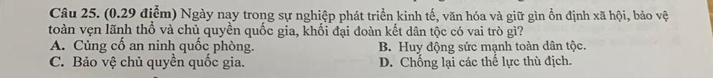 Ngày nay trong sự nghiệp phát triển kinh tế văn hóa và giữu gìn ổn định xã hội bảo vệ toàn vẹn lãnh thổ và Chung quyền Quốc gia khối đại đoàn kết dân tộc có vai trò : Bảo vệ chủ quyền quốc gia.