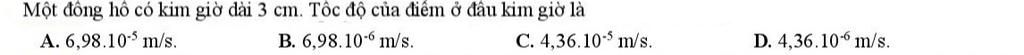 `=>` `v = \omega . R = {2\pi}/{43200} . 0,03 = 4,36. 10^{-6}` `(m//s)`