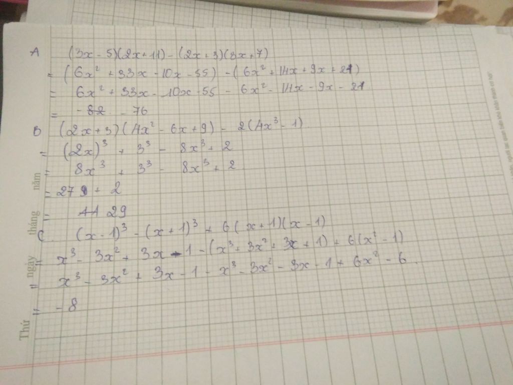 `A=(3x-5)(2x+11)-(2x+3)(3x+7)`