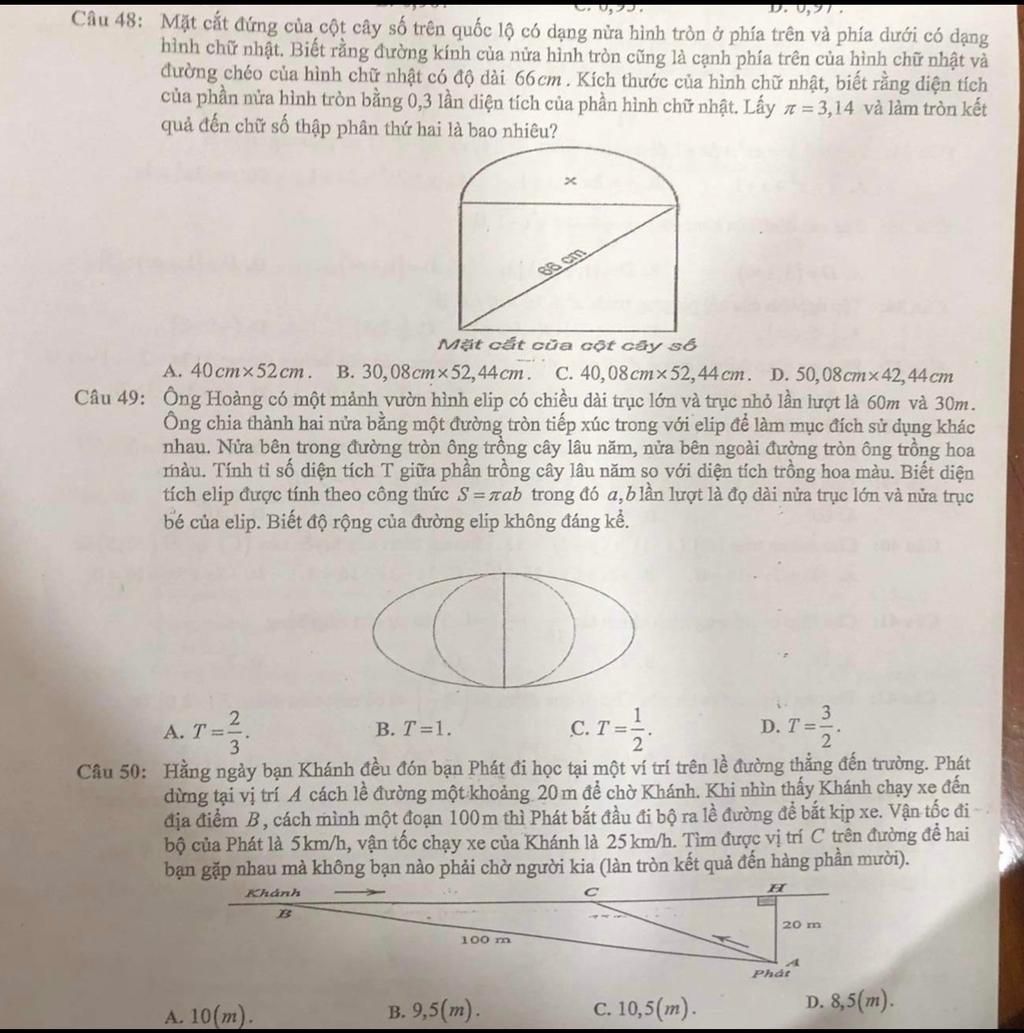 Câu 48: Mặt cắt đứng của cột cây số trên quốc lộ có dạng nửa hình tròn ở phía trên và phía dưới có dạng