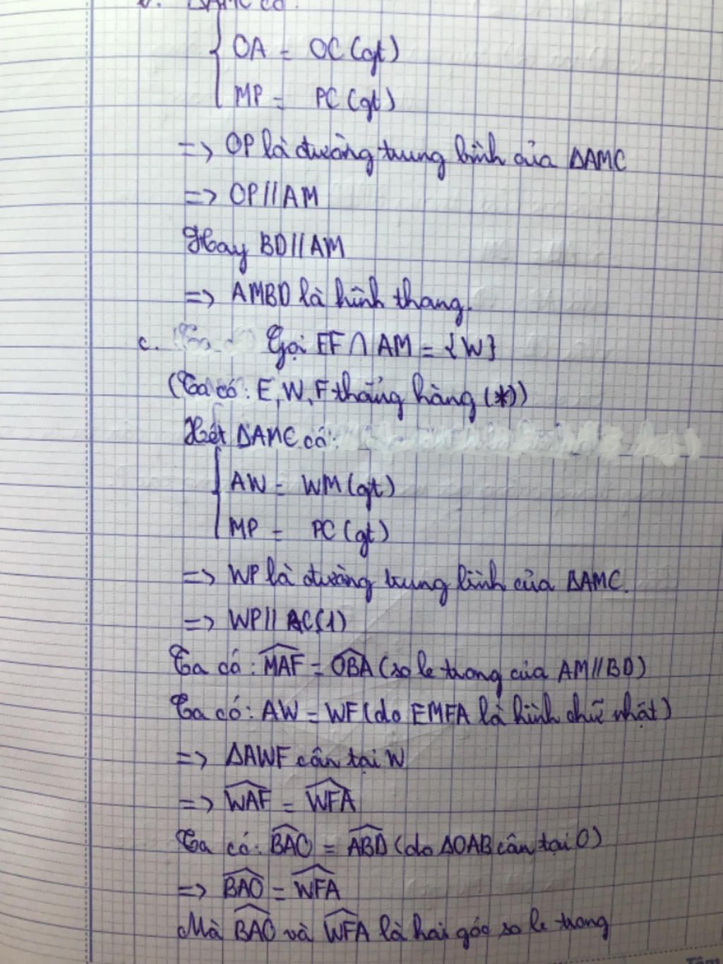 P là trung điểm MC, O là giao điểm 2 đường chéo của HCN ABCD nên O là trung điểm AC
