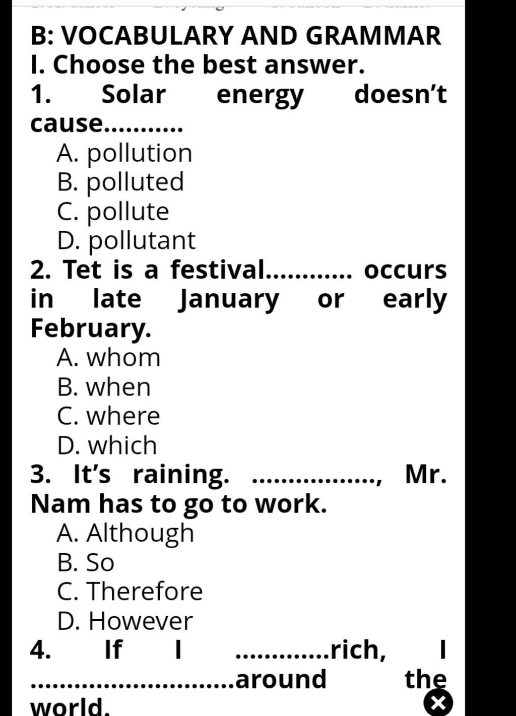 --> câu D: có dấu hiệu là "or" thì chọn "which"