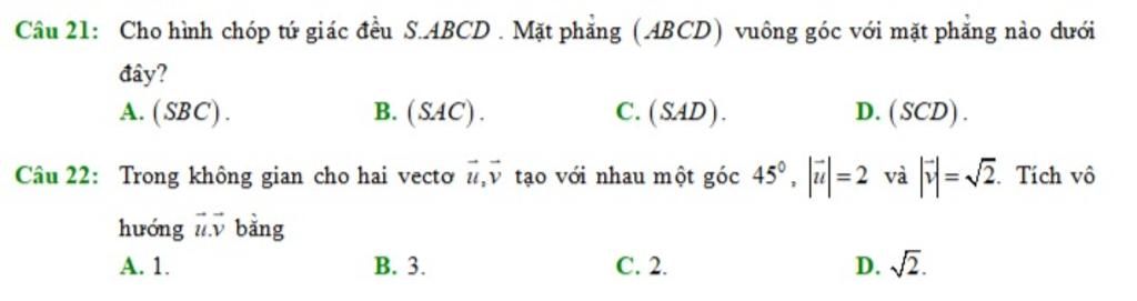 `\vec{u}.\vec{v}=|\vec{u}|.|\vec{v}|.cos(\vec{u}; \vec{v})=2.\sqrt{2}.cos45^o=2`