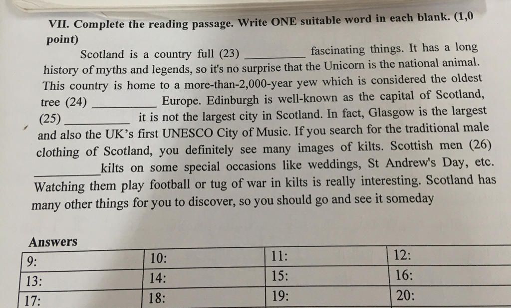 VII. Complete the reading passage. Write ONE suitable word in each blank. (1,0