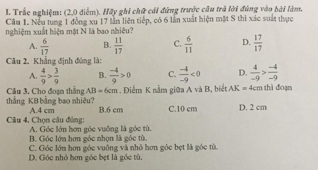 Câu 4: C. Góc lớn hơn góc vuông và nhỏ hơn góc bẹt là góc tù