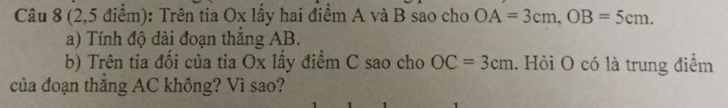 Câu 8 (2,5 điểm): Trên tia Ox lấy hai điểm A và B sao cho OA = 3cm, OB = 5cm.