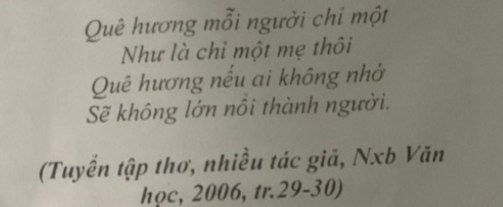 Bài thơ trên nói đến tình yêu quê hương.Trong đó,tác giả nói rằng "quê hương" thì mỗi người chỉ có một,"như là chỉ một mẹ thôi".Phép so sánh trên là sự khẳng định rằng "quê hương" chỉ có một và chúng ta cần trân trọng nó.Nó cũng làm cho câu thơ thêm sức gợi hình,gợi tả.Không nhớ về quê hương,nghĩa là không nhớ đến cội nguồn,nơi chôn rau cắt rốn của mình.Một sự vô ơn,bạc tình bạc nghĩa,sẽ không thể nào "lớn nổi thành người".Như vậy,dù có đi đâu xa hãy luôn hướng về quê hương-nơi yên bình nhất trong tim mỗi người.