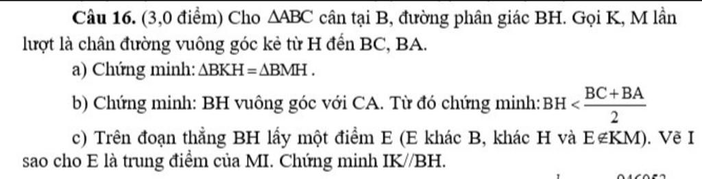$\widehat{HBK}=\widehat{HBM}$ vì $BH$ là phân giác $\hat B$